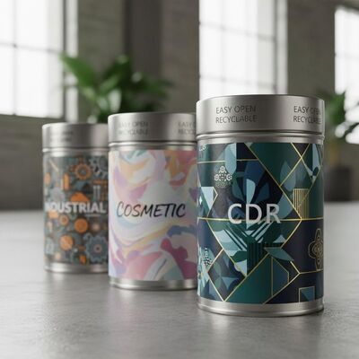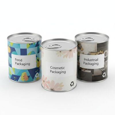Recyclable metal tin cans featuring custom artwork in CDR format, suitable for food, cosmetic, and industrial packaging applications.