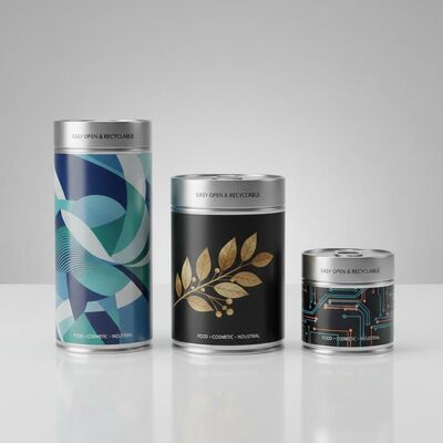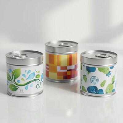 Recyclable metal tin cans featuring custom artwork in CDR format, suitable for food, cosmetic, and industrial packaging applications.